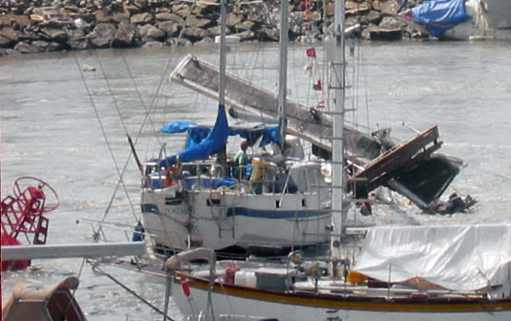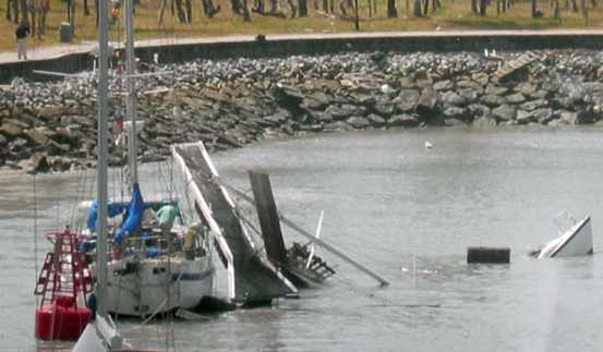 schweren Pfähle, sowie die Stege rausriss und mitsamt den Yachten durchwirbelte