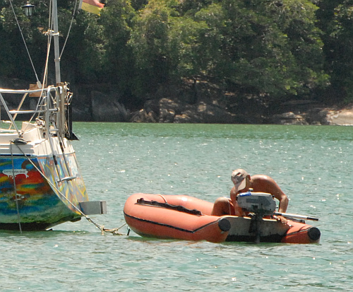 verzweifelt, selbst erfahren Weltumsegler, vergeblich versuchen, den Außenborder des Beibootes in Gang zu bringen. Was meistens gelingt, aber nicht immer. Hier