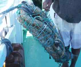 die Tauwerksabfälle mit vergammelten Netzen ummantelt wurden.