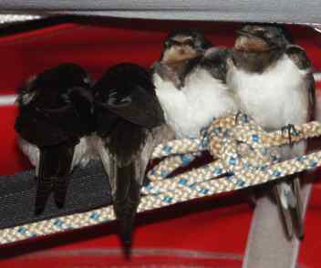 Annäherung an die Singapur-Street Besuch bekamen. Eines Abends ließ sich ein Schwalbenpärchen nieder, drückten sich zusammen auf einen Stropp,