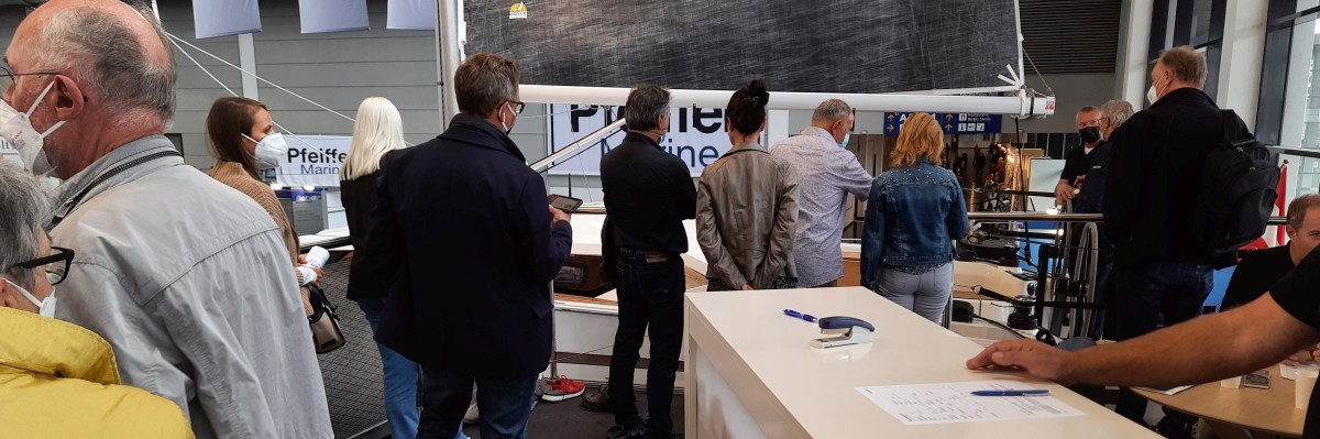 Was auch für die größeren Yachthersteller galt. Bei Sunbeam nannten Insider dreißig verkaufte Yachten. Was sich sicher in erster Linie auf den Ausstellungsknüller unter den Schiffen, die SUNBEAM 32.1 bezog, die trotz ihres ungewöhnlichen, ja gewöhnungsbedürftigen Aussehens und des Preises von 250 000.-€ für einen "Daysailer" (so Sunbeam selbst) so viel Anziehung entwickelte, dass es schwierig war, sich in der Schlange - siehe unten - zu einer Besichtigung durchzukämpfen.