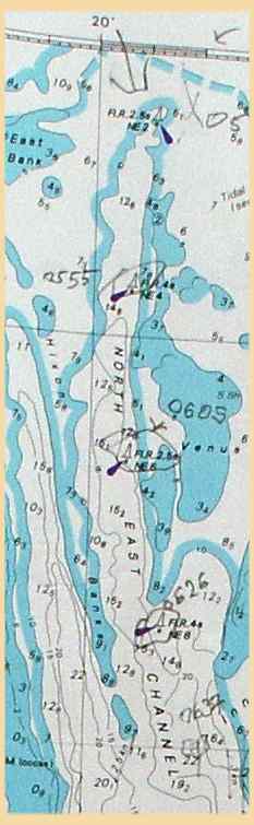 Bleistiftstrich in der Karte lediglich eine auffällige Untiefe mit 10 Metern.