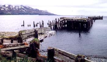 die Ruinen, riesige hölzerne Landungsbrücken halb zerfallen, überall Felsen