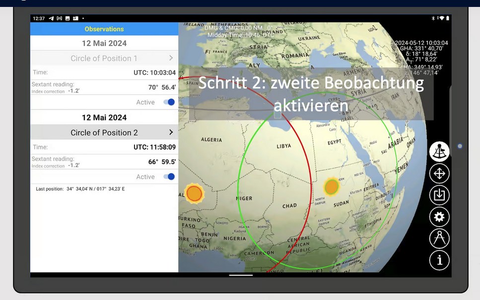 Richtig ist: Zwei Höhengleichen ergeben auf der Erdoberfläche zwei Schnittpunkte – einer davon ist der tatsächliche Schiffsort. In der Praxis gilt es also, lediglich den Schnittpunkt zweier solcher Höhenkreise zu berechnen, um die Position zu bestimmen. Das erscheint in der Tat einfacher und auch moderner.