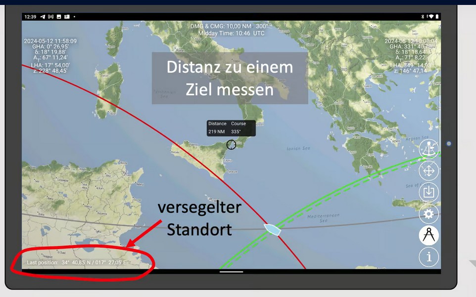 Wen es interessiert: Aus dem Abstand zur Standlinie kann auf einen Blick grob erkannt werden, ob der gemesssene Winkel passt oder ob der gegißte Schiffsort grundfalsch ist.