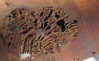 zahlreicher Zinkanoden in der Nähe völlig von Lochfraß zerstört. Der Bruch