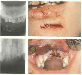 Unfall: Zwei Verletzungen der Weichteile mit Zahntrauma. Eine solche Wunde sollte auf jeden Fall wenigstens durch Situationsnähte so versorgt werden, dass die Wundränder adaptiert sind. Sollten die Zähne frakturiert sein, müssten sie evtl. entfernt werden. Die Wundränder sind sowohl von außen wie von innen zu adaptieren. Dies kann leicht in Lokalanästhesie (leichte Technik) geschehen.