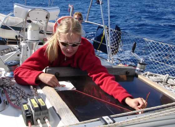 Untergrund, beispielsweise auf dem Schiebeluk eines Segelbootes, das Ablesen der