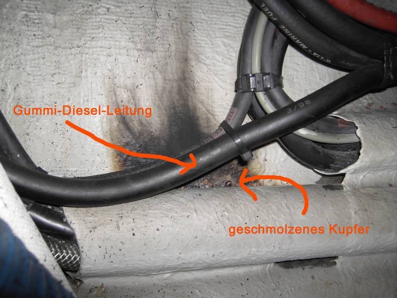 Ok! Das kann ja mal passieren. Aber schauen wir uns das Foto rechts genauer an: Da ist jedenfalls flüssiges Kupfer herabgetropft und um Millimeter wurde die Dieselleitung gerade so mal verfehlt. Die wenigen Millimeter, die das Kupfer "daneben" ging, haben das ganze Schiff, einen riesigen Katamaran gerettet. Kupfer hat nämlich eine Schmelztemperatur von über 1000 Grad. Und nur durch ein Riesenglück wurde die flexible Dieselleitung nicht vom Kupfer getroffen. Denn dann wäre ein Leck in der Treibstoffleitung entstanden. Diesel entzündet sich bei Teperaturen zwischen 220 und 300 Grad. Mehr braucht wohl nicht gesagt werden.