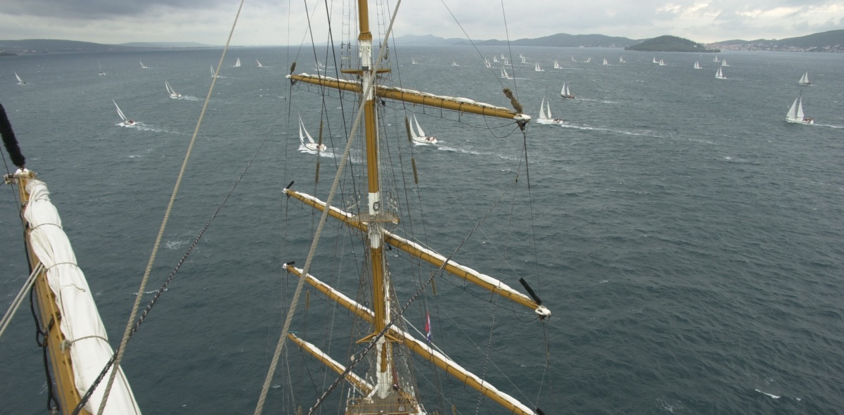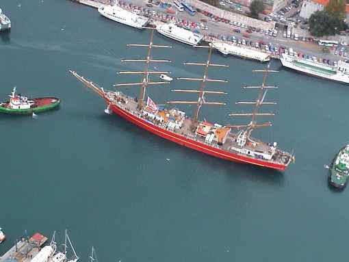 Das „Begleitschiff“ war das ganze Jahr über ein ständiges Thema bei der Organisation der Cups. Und so trafen sich die Freunde von Kurt in seinem schönen Haus im „Trink-Kreis". Zu vorgerückter Stunde wurde Kurt aufgezogen, dass seine Begleitschiffe trotz der AMORINA mit 35 Metern Länge und der PANORAMA mit 50 Metern ja wohl etwas mickrig seien. Gut, Ecker lächelte nur geheimnisvoll in sich hinein. Warum, das sahen wir, als wir in Zadar zum Regatta-Start eingeflogen waren und unseren Augen nicht trauten. Dort lag im Hafen ein Rahsegler, der nur mit Hilfe von sauteuren Schleppern umdrehen konnte.