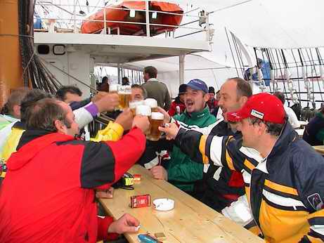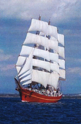 Es handelte sich um die KHERSONNES unter ukrainische Flagge, mit ihren 104 Metern Länge schlicht die viertgrößte Segelyacht der Welt, die Kurt für einige Hunderttausend DM aus der Ostsee angechartert hatte. Ein atemberaubender Anblick! Und die Mitfahrt war für die Beteiligten am Ecker-Cup ein unbeschreibliches Erlebnis. Wann bekommst Du schon zu sehen, wie ein Meeresriese unter 30 tausend Quadratmetern Segel ohne Winschen, nur mit Hilfe von 80 Kadetten, gehandelt wird? Das Segelerlebnis ihres Lebens!