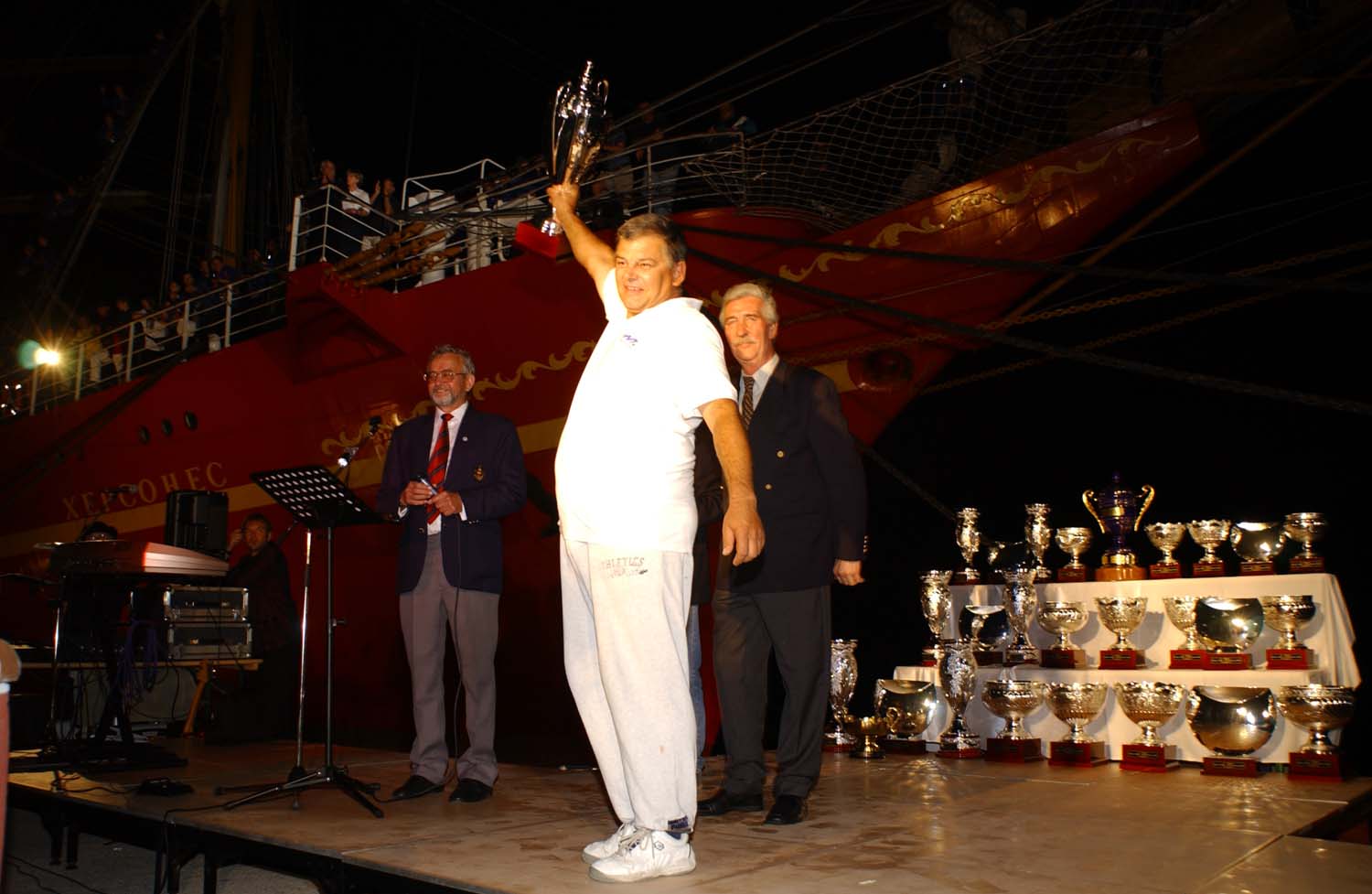 Die Geschichte der Siegerehrungen und der Feste drumherum allein würde ein ganzes Buch füllen. Beispielsweise traf man bei der Feier in Alexandria den berühmtesten Segelhelden der Welt, Eric Tabarly, eigens mit einer persönlichen Dolmetscherin aus Frankreich angereist. Weiteres Beispiel: Das Museum in Monastir, das weltberühmte Ribat, wurde extra für die Teilnehmer nach langer Zeit wieder geöffnet. Und andere Siegerehrungen wurden mit dem Auftritt von Bauchtänzerinnen oder auch mit (echten) Kamelen unvergeßlich gemacht. Und der Bürgermeister von Pylos ließ es sich nicht nehmen, bei den dortigen Zwischenstopps der Regatta jeweils ein großes Bürgerfest mit Büffet und althergebrachten Trachten und Tanzaufführungen für die hunderten von Seglern zu veranstalten. Die fast gruselige, düstere Prozession der Fischer in Zadar nach uraltem Brauch, daran erinnern sich alle Teilnehmer mit gemischten Gefühlen.