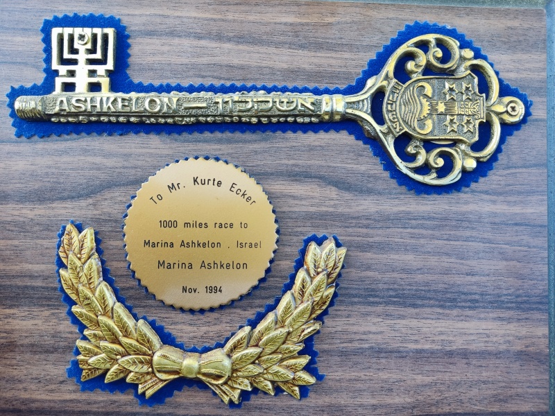 Das romantischste Erlebnis bei allen Ecker-Cups war für mich die Siegerehrung in Israel, die ich bei Dunkelheit im Scheinwerferlicht aus dem 50 Meter hohen Rigg der AMORINA heraus in Ashkelon (wo Kurt Ecker vom Bürgermeister der Stadt mit dem Goldenen Schlüssel zur Stadt ausgezeichnet wurde - (Bild links) vor 600 gebannten Zuschauern moderieren durfte - unvergeßlich!