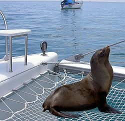 Wir hatten uns bereits an die Geräusche der im Wasser herum planschenden Seelöwen und Pinguinen gewöhnt, als ein neues Schnaufen neben der Bordwand unsere Aufmerksamkeit erregte: Dort schwamm SEBASTIAN im eiskalten Wasser und kam triefend an Bord.