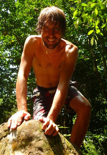 Wir fragten weiter und schließlich versprach man, uns auf den Felsen hinauf zu führen. Der Pfad lief durch dichten Dschungel an der Wasserleitung entlang, die das Dorf versorgte. Irgendwann trennten sich Leitung und Weg, ohne Führer wäre die Orientierung hier schon schwieriger geworden. Kurz unter dem Gipfel mussten wir auf nacktem Fels weiterklettern. Für die Hinweise unseres Führers nach dem besten Weg waren wir spätestens hier sehr dankbar. An den steilsten Stellen waren Seile gespannt, an denen man sich heraufziehen konnte.