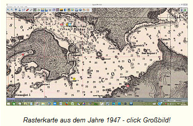 Die blaue Spur ist von uns, die pink farbigen sind von anderen Schiffen. Bei der GoogleEarth-Karte scheinen die pinkigen Tracks der idealere Weg zu sein, als unserer. Da wir aber über eine "coole" Karte aus dem Jahre 1921 (!) verfügten, nahmen wir den dort vermerkten Weg und fuhren ohne Probleme in die Bucht ein. Die später einfahrenden Fischerboote bestätigten uns in unserer Entscheidung, weil sie alle denselben Weg (unseren) benutzten.