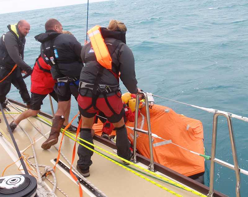 Was in den Sicherheitstrainings nicht unbedingt vermittelt wird, ist die Schwierigkeit, die Personen an Deck zu bekommen. Man sollte nicht davon ausgehen, dass sehr viel Verständnis oder Kooperation aufgebracht wird. Es muss aber sehr kontrolliert ablaufen, denn man möchte ja auf keinen Fall auch gleich noch einen Mann über Bord haben. Die erste Herausforderung ist also, so an die Rettungsinsel hinzufahren, dass sie stabil neben einem steht. Bei Seegang und Wind, hält man eine 10-Personen-Rettungsinsel nicht einfach so mit der Hand fest. Es gibt bestimmt verschiedene Varianten, aber ich würde sagen, dass man die Insel treiben lässt und versucht mit einem sehr guten Steuermann die Yacht „auf Höhe“ zu halten. Was nicht passieren sollte, aber dennoch passiert, wenn man vorher nicht mit den Insassen der Rettungsinsel gesprochen hat, ist, dass mehrere aus der Rettungsinsel an der Reling hängen, sobald sie diese fassen können. Das gilt es wirklich zu verhindern. Die Gefahr, dass jemand ins Wasser fällt, ist einfach zu groß und außerdem passt man mit aufgeblasener Rettungsweste kaum durch den Draht der Reling durch und sich oben drüber zu hangeln, ist in dieser Situation eher etwas für Kunstturner.