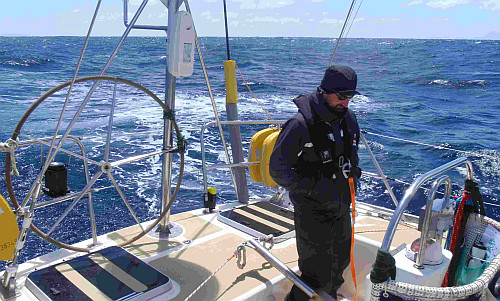 Natürlich passiert so etwas auch nicht kurz vor dem Ziel sondern ziemlich genau in der Mitte der Ozeanpassage. Wir hatten noch 1.100 sm bis Kapstadt hinter uns zu bringen. Ein 30 Tonnen Schiff erfordert eine etwas aufwändigere Konstruktion und Bedienung der Notpinne. Auf den Bildern kann man erkennen dass wir Leinen an beiden Seiten befestigt hatten, die über Blöcke auf Winschen im Cockpit gelegt waren. Nun saßen also an jeder Winschen jeweils zwei Personen, eine mit einer Winschkurbel in der Hand zum Dichtholen und eine mit der Leine