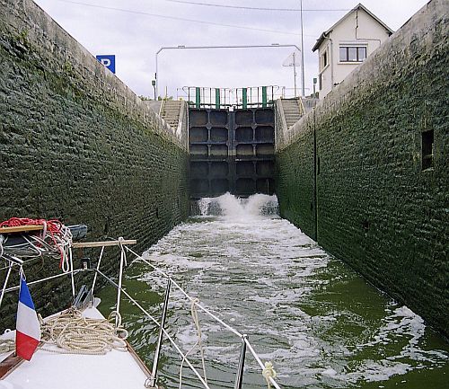 also der Schwelle, an die das geschlossene Schleusentor einer Schleuse stößt. Das hätte ja leer schon nicht gepasst. Mein erster Gedanke war: „also doch Biskaya“ und ich fing sofort an im Kopf zu kalkulieren, wie viele Meilen das wären, wie lange diese Strecke wohl dauern würde und ob sie Ende August - Anfang September noch ratsam ist. Dann fiel mir ein, dass Heike ja schon einen Flug nach Montpellier ans Mittelmeer gebucht hatte, wo sie zu uns stoßen wollte. Nachdem sich der erste Schreck gelegt hatte, beschloss ich es einfach zu versuchen. vielleicht war der Drempel ja doch 10 cm tiefer und wir würden es schaffen. Danach sollten wir keine Probleme mehr haben, da die Maas und die Kanäle durch die