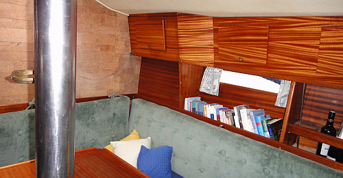eine riesige Pantry, ein fast perfekter Navigationsplatz und ein Achterschiff mit eigener Toilette. Aber man sah dem Schiff, vor allem unter Deck, sein langes Leben an. Irgendwann hatte jemand die in 80er Jahren so beliebten Korkplatten auf alle Holzteile geklebt. Der Pflegezustand war optisch eher mäßig, doch technisch war alles ohne Tadel. Wir fühlten uns im tiefen Cockpit sofort geborgen und waren hin- und hergerissen.