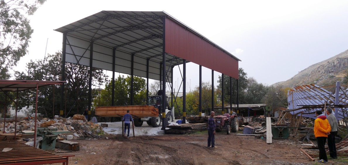 Mein erster Wunsch war, ein festes Dach über dem Bootbauplatz zu errichten, damit das Holz nicht gleich im ersten Winter durch den vielen Regen leidet. Ohne eine Sekunde zu überlegen wurde diesem Wunsch entsprochen und zwar ohne Aufpreis! Ich vermute, dass Mehmet schon länger mit diesem Gedanken spielte. Das Dach war schnell gebaut, das geht in der Türkei ohne Statik und sonstige große Formalitäten. Dafür dauerte aber die Genehmigung, ein Schiff für einen Ausländer bauen zu dürfen, mehrere Monate , und eine Truppe hoher Beamter inspizierte dafür das Gelände.