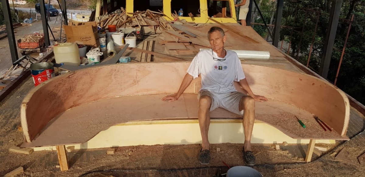 Über die Pinienplanken wird dann eine Lage von 5-mm-Bootbausperrholz geklebt und darüber kommen zwei Lagen Glasfasermatten. Sperrholz deshalb, damit die Matten sich nicht ablösen, wenn die Planken aus weicherem Holz durch die Luftfeuchtigkeit arbeiten. Der ganze Rumpf wird im Anschluss in üblicher Weise mit einer Epoxi Sperrschicht, mehreren Lagen Spachtel und noch einer Sperrschicht abgedeckt. Auf ein Schleifen mit einer langen Latte hatte ich verzichtet. Denn nur für eine glatte Außenhaut nochmals mehrere Wochen spachteln und Schleifstaub einatmen wollte ich nicht, zumal die Atemschutzmasken hier nur aus OP-Masken bestehen und der Arbeitsschutz nicht so streng befolgt wird.