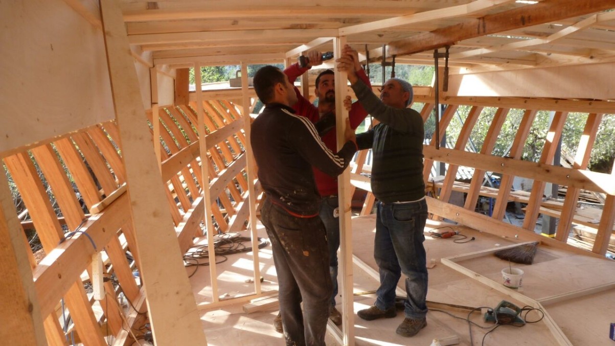 Was unsere Bootsbauer kaum verstehen konnten, war, dass wir die altmodische Art der Seitenwände und Decken bevorzugten, bei der man die Balken sehen kann. Inzwischen wird hier in der Türkei alles isoliert und mit doppelter Wand versehen, zumal die Gäste fast ausschließlich auf Klimatisierung bestehen. Wir hingegen wollen, dass überall an das Holz Luft kommt und so auch gleich zu erkennen ist, wenn irgendwo eine Undichtigkeit ist.
