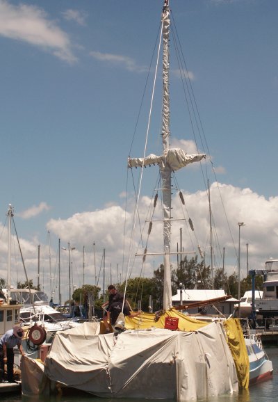 Das Ankommen, auch vor Corona, ist mit dem Anwachsen der Blauwasserszene viel stringenter geworden als noch vor ein paar Jahren. Lange bevor wir nach Australien segelten, schon aus Tonga, mussten wir um ein Visum per Email bei den australischen Behörden bitten, ja betteln. Und als Australien schon fast in Sicht war, kreiste ein Flugzeug über uns und funkte unseren Schiffsnamen. Nach kurzer Befragung, man könnte auch von einem "Verhör" sprechen, durften wir Richtung Australien weiterfahren. Wo wir dann von den netten Landwirtschaftsleuten willkommen geheißen wurden. Wir waren schon vorbereitet auf das, was jetzt kommen würde, konnten uns also durchaus auf die ganz ungewöhnliche Prozedur einrichten, nämlich die Yacht von allen Lebensmitteln zu befreien und penibel auf Schädlinge vom Herrn/Dame des Landwirtschaftsamtes durchsuchen zu lassen, selbst in der Bilge und unter den Bodenbretter. Wehe, es werden beispielsweise Kakerlaken gefunden, dann heißt es: "Fumigating!", also ausräuchern! Dabei wird die Yacht wortwörtlich komplett in Tücher gehüllt, ja bis zur Mastspitze - siehe Fotos. Bis dann das Gas kommt. Macht einige zigtausend Dollar.