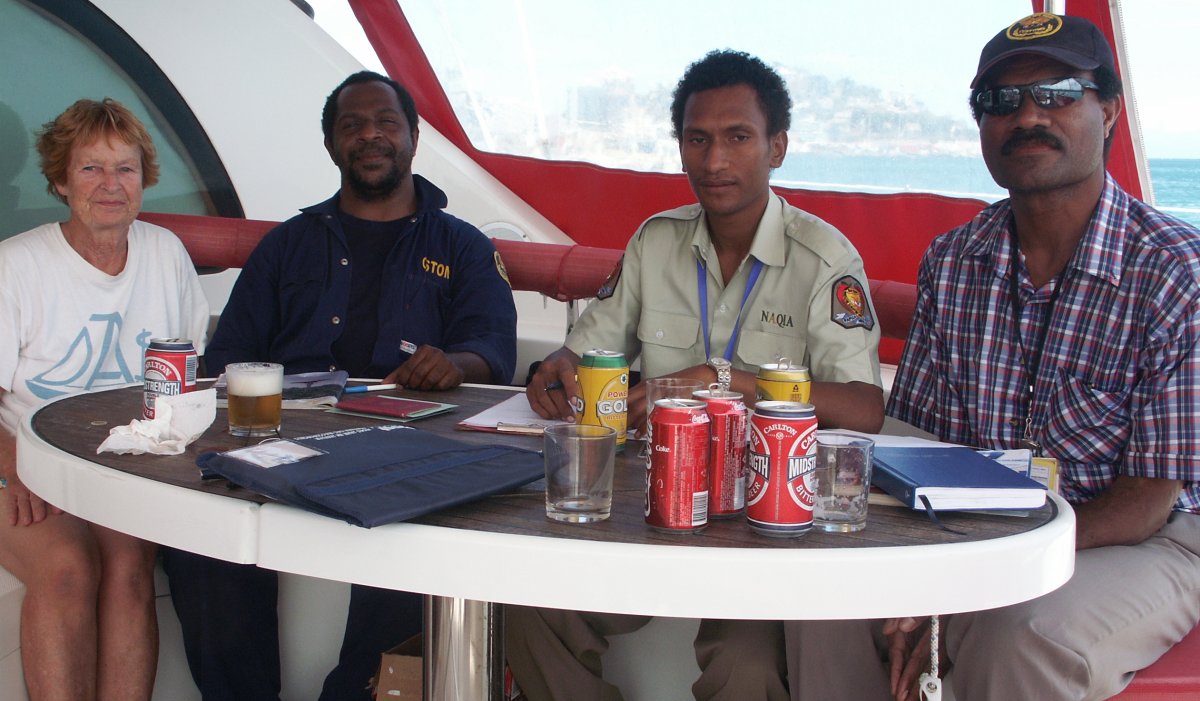 Am skurrilsten war die Einklarierung auf den Neuen Hebriden (heute Vanuatu). Denn das war ein Condominium, das heisst eine Art Gemeinschaftsregierung von Frankreich und England. Behörden, Schulen, Sprache - alles gab es doppelt. Wer sich mal schon Gedanken über die sehr spezifischen Wesensunterschiede von Franzosen und Engländern gemacht hat, kann sich kaum vorstellen, dass das gut gehen kann. Aber die Geschichte lehrt das Gegenteil. Alles funktionierte bestens und zum Wohlergehen der einheimischen Insulaner. So auch die ganz normale Einklarierung, bis auf die Tatsache, dass wir zweimal die Prozedur und zweimal den Papierkrieg durchmachen mussten. Mit Ausnahme der gemeinsamen Barkasse zum Besuch der Yacht gab es nichts Verbindendes zwischen den englischen und den französischen Abordnungen. Also waren an Bord der kleinen THALASSA getrennte Zollbeamte, getrennte Ärzte, getrennte Zöllner sowie zwei Dolmetscher für französisch und Englisch. Nebenbei: Die Neuen Hebriden habe ich in angenehmster Erinnerung.