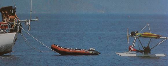 für ein Ultra-Light-Flugzeug mit Schlauchboot darunter als Schwimmer auf dem