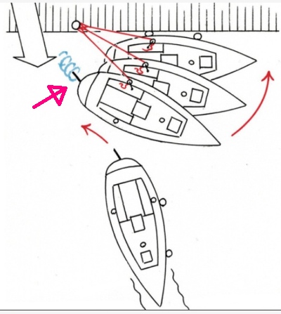 Das sieht gar nicht gut aus, zumal auf der Zeichnung beim Lesertipp keine Fender ausgebracht sind. Sicher, man könnte dann schon irgendwie anlegen wenn der Bug sehr gut abgefendert wäre. Aber wir machen uns anschließend noch eine Menge zusätzlicher Arbeit, bis es letztlich gelingen wird, die Yacht schön längsseits zu bekommen. Mühen unter den Kommentaren der Zuschauer, die wir uns hätten ersparen können, wenn wir mit ablandigem Ruder gefahren wären!