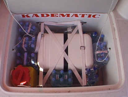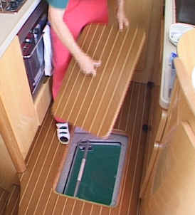 Es gibt noch eine dritte Luke und die könnte nun wirklich lebensrettend sein. Denn nur durch sie kommt man im Kenterungsfall an die Rettungsinsel ran. Die Insel von Fa. Kadematic speziell vorbereitete Insel - mit dem unerläßlichen EASY-BOARDING-SYSTEM natürlich - , liegt im Boden des Cockpites in einer "Backskiste", deren Boden die Luke darstellt. Diese Luke läßt sich auch vom Schiffsboden aus öffnen. Neben der Insel gibts dann noch Wasser in rauhen Mengen und der wichtige (gelbe) wasserdichte Überlebenscontainer, der all dies enthält, was man gerne in der Rettungsinsel gehabt hätte, nämlich Angelzeug, UKW-Handy, GPS, Medikamente etc. Warum nicht gleich in der Rettungsinsel verpackt? Es hat sich in den letzten Jahren herausgestellt, dass es eben eine Reihe von zusätzlichen lebensrettenden Mitteln gibt, die schon von der Größe her nicht alle in die Rettungsinsel passen. Außerdem sind einige von ihnen wartungsintensiv, gar gefährlich für die anderen Rettungsmittel. Es ist beispielsweise eine mittlere Katastrophe, wenn eine "auslaufsicher" Batterie in einer verpackten Rettungsinsel ihre Säure abgibt. Man denke an die Warnung bei allen elektronischen Geräten: "Alte Batterien nicht im Gerät lassen!" Nachdem zahlreiche Seenotfälle bewiesen haben, dass die Überlebenshancen von Schiffbrüchigen erheblich gestiegen sind, wenn sie ausser der Insel noch weitere Gegenstände retten konnten, ist es unwahrscheinlich, dass man in die Rettungsinsel nicht mindestens einen weiteren Gegenstand nitnimmt. Und das wird der Überlebenscontainer sein.