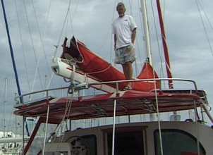 konnte die Solarzellen oben auf dem Biminidach, auf beiden Seiten des Großbaums
