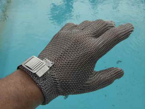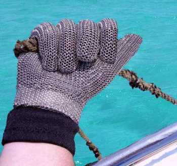 Handschuhe aus einem Geflecht von winzigen 3mm-Stahlringen, die sogar davor