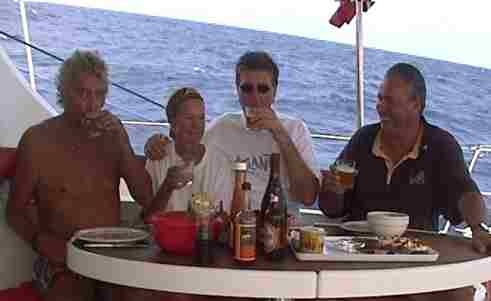 mangels eigenem Boot, mit Beiboot auf den Katamaran gebracht werden, wo sie ein