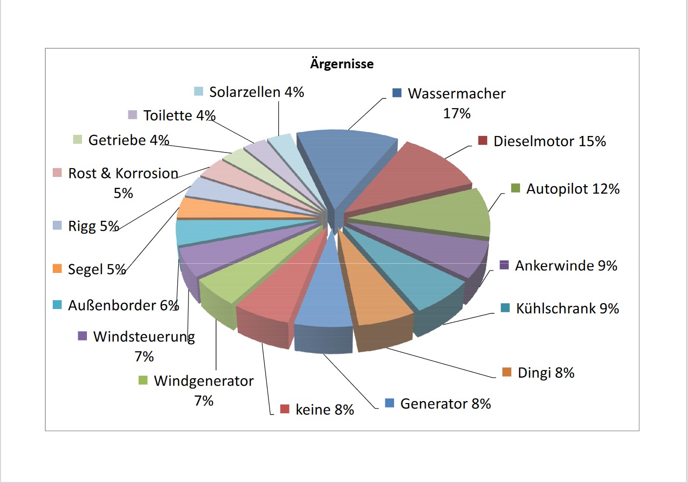 Fast aus der Rolle fällt der Dieselmotor mit 15 Prozent. Nachdem praktisch dieser auf allen zu Hause ist, heißt das, dass ein Sechstel aller Yachten Probleme mit dem Hauptantrieb bekommt. Man muss kein Hellseher sein, um vorauszusagen, dass diese Motoren in Zukunft noch mehr Probleme bekommen, denn es wird immer schwieriger, unterwegs in abgeschiedenen Gegenden an sauberen Treibstoff zu kommen - erste Voraussetzung, um sich keine Dieselpest an Bord zu holen. Nebenbei: Hatte Ihr PKW zu Hause schon mal einen Motorschaden? Das müßte nachdenklich machen.