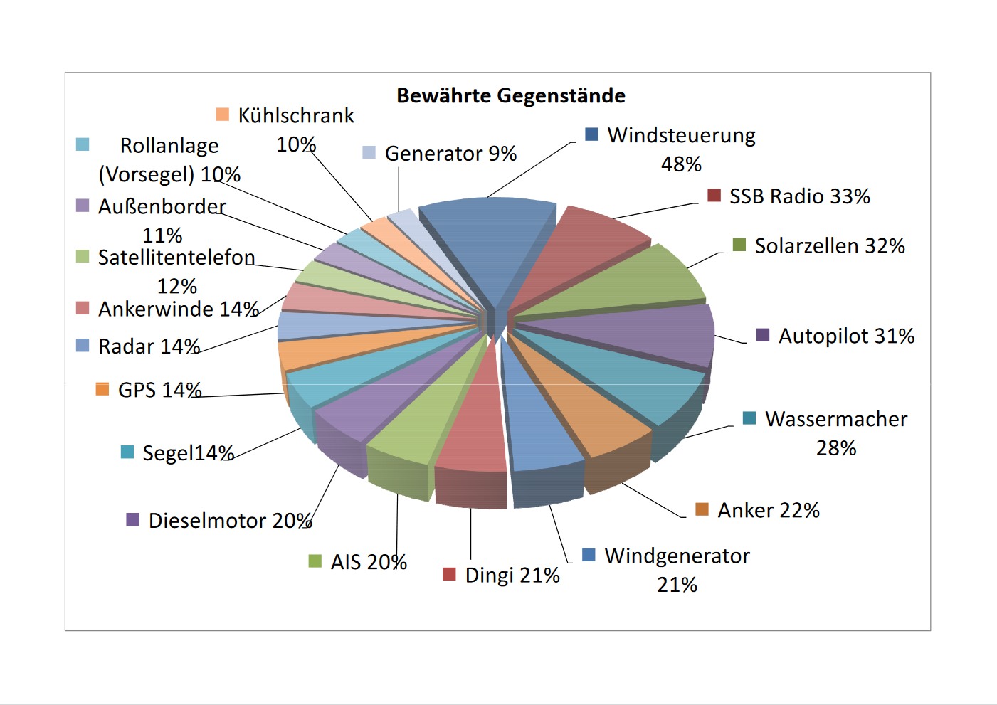 Abgeschlagenes Schlusslicht in der Zufriedenheits-Grafik ist, für mich erwartungsgemäß der Generator. Dass die Windsteuerung (WSA) mit 48% hier an erster Stelle in der Zufriedenheit steht, überrascht nicht. Wie auf keinen anderen Ausrüstungsgegenstand ist der Blauwassersegler auf den "stummen Diener" am Heck angewiesen. Lesen Sie mal die Berichte, wo der für einige Zeit - selten - ausgestiegen ist! Und dementsprechend wird er auch gehegt und gepflegt, was sich offensichtlich auszahlt. Mit Lob soll man nicht hinter dem Berg halten: Es ist kein Geheimnis, dass auf den meisten Langfahrtyachten am Heck ein deutscher Windpilot angebracht ist.