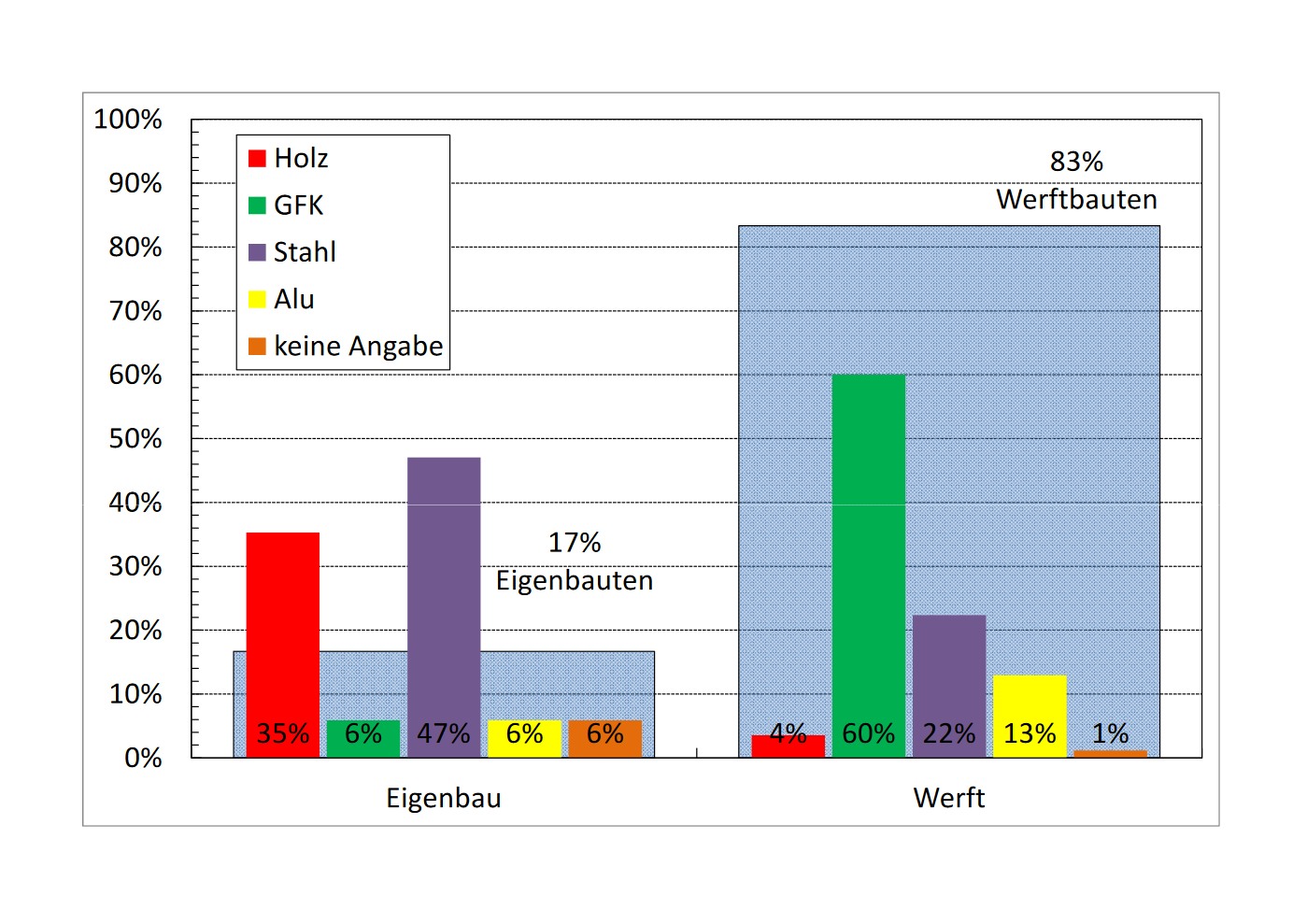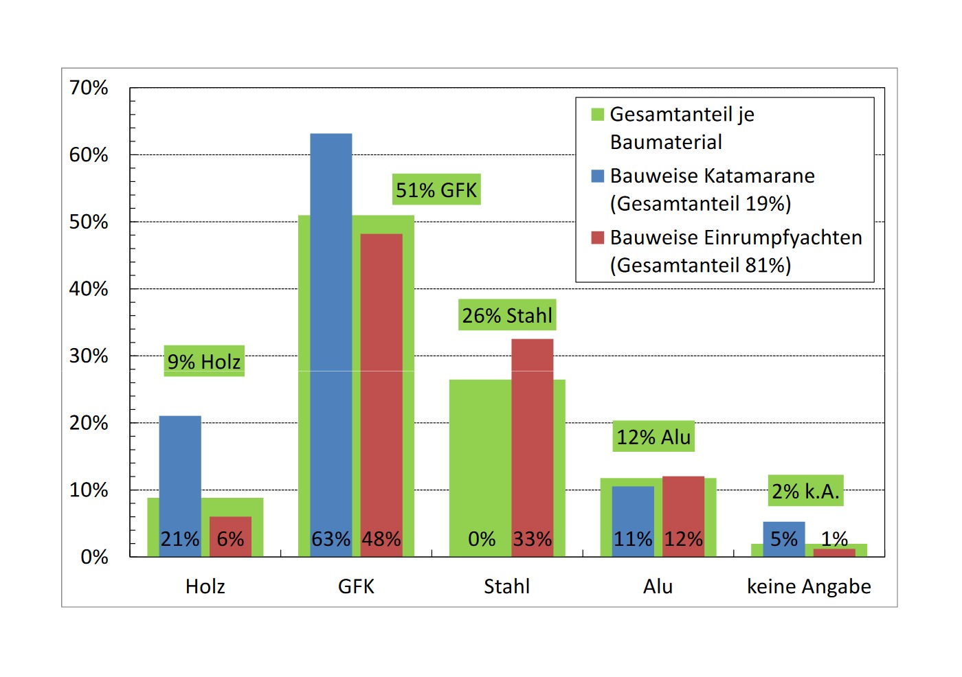 Bei den Einrumpfyachten sind die meisten Yachten aus GFK (51%), gefolgt von Stahl (26%), was vor allem bei den Eigenbauten (z.B. nach den Plänen von Reinke), aber auch bei den kleineren und vorwiegend älteren Werftyachten seinen Grund hat. 12% aller Yachten bestehen aus Aluminium, die niedrige Prozentzahl wird nicht etwa durch die miese Qualität von Alu als Baumaterial bestimmt, sondern allein durch seinen relativ hohen Preis.