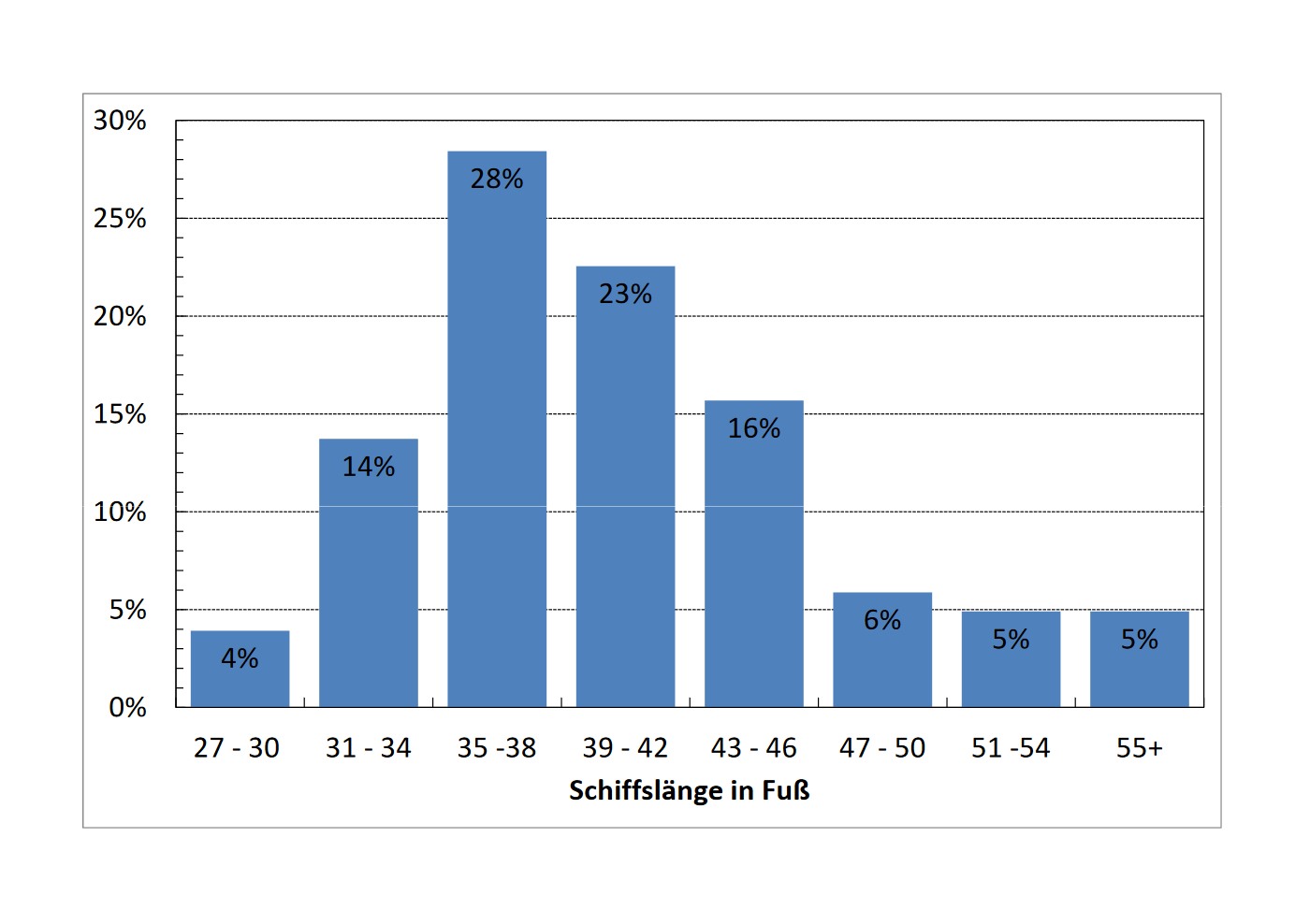 Nur zwei Yachten unter 9 Meter finden sich in den erfassten Daten. Die Mehrheit aller Yachten ist zwischen 10 und 12 m lang, was offensichtlich eine gute Größe im Sinne der Bedienung und des Platzangebotes, also des Wohnkomforts für die typische Crew von zwei Personen darstellt. Die Durchschnittslänge aller ausgewerteten Yachten liegt bei 41 Fuß, lässt man die großen Yachten über 55 Fuß außer Acht, dann ergibt sich ein Durchschnittswert von 39 Fuß. Man sieht, dass sowohl ein Schiff von 9 Meter als auch ein Schiff mit 20 Meter den Widrigkeiten der Meere gewachsen sein kann. Doch natürlich segelt sich ein 20-Meter-Schiff normalerweise weitaus angenehmer, bedarf aber auch sehr viel mehr Wartung, was sich deutlich in den Kosten niederschlägt - und eventuell in der Notwendigkeit einer bezahlten Crew.