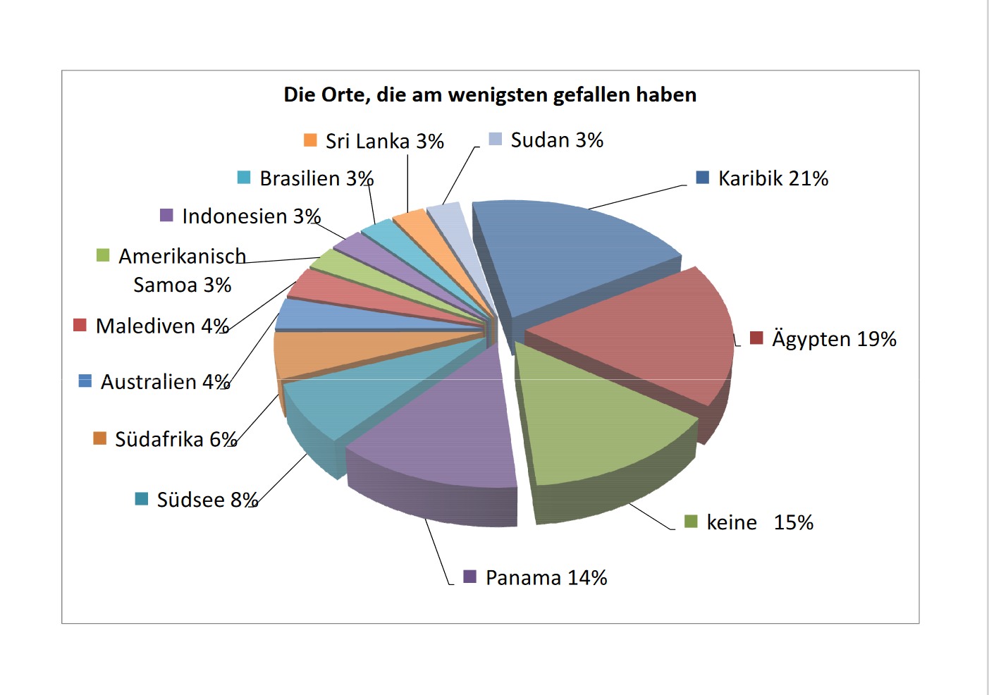 Wo hat es den Weltumseglern am wenigsten gefallen? Hier liegt eindeutig die Karibik mit 21Prozent an erster Stelle. Gemeint sind hier vor allem die kleinen(!) Antillen. Ziemlich oft erwähnt, die Gründe: Kriminalität und Unfreundlichkeit! Auch Ägypten hat viele Segler nicht überzeugt, was hauptsächlich an der dort herrschenden, zum Teil korrupten Bürokratie liegt. Panama hat 14 Prozent der befragten Yachties nicht gefallen. Vielleicht lag das daran, dass man dort, wirklich kein tolles Segelgebiet vorfindet, sich relativ lange dort aufhalten muss, um alle Formalitäten für die Kanaldurchfahrt zu erledigen und um das Schiff für den Pazifik zu verproviantieren. Auch die Südsee, ansonsten der Traum für viele Hochseesegler - siehe unten, hat es mit wenigen 8% unter die am wenigsten beliebtesten Plätze "geschafft", was darauf schließen lässt, dass das dort Erlebte sehr individuell beurteilt wurde.