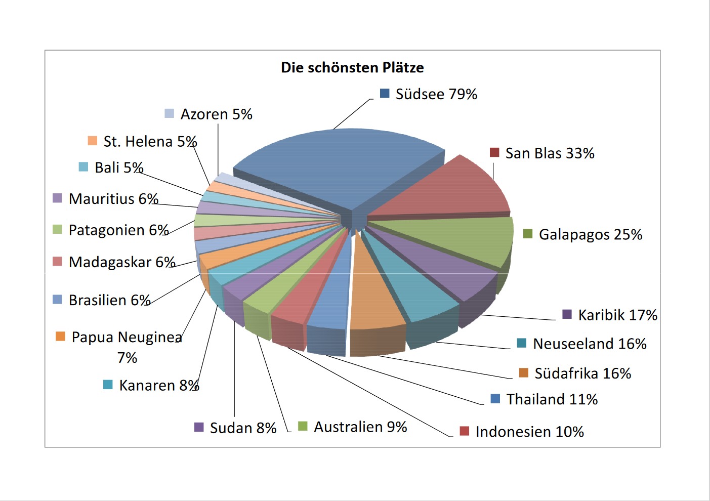 Hier "schlägt", nicht überraschend, mit überragenden 79% die Südsee, also das Gebiet im Südpazifik zwischen Galapagos und Neuguinea, zu. Was beweist, dass die meisten Segler, die nach der Ferne trachten, zu Recht vom Platz, wo die Meuterer von der Bounty für Polynesien ihren Tod riskierten, träumen. Dass die San Blas-Inseln mit immerhin 33% an zweiter Stelle genannt werden, hat wahrscheinlich auch mit der Karibik zu tun. Denn, wie obige Umfrage beweist, war die Karibik, nach dem sie achteraus liegt, letztlich für viele Segler eine Enttäuschung, und um größer ist dann die Überraschung, wenn sie die malerischen San Blas-Inseln mit den freundlichen Ureinwohnern der Karibik, den letzten überlebenden Kariben, erreichen.