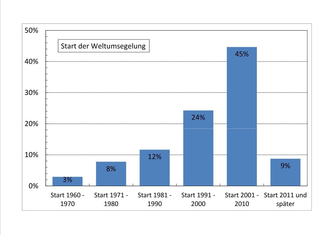 Hier ist ein deutliches Maximum im ersten Jahrzehnt dieses Jahrhunderts. Dafür gibt es aber auch einen scheinbaren Rückgang in den Jahren danach, was sicher daran liegt, dass derzeitige Weltumsegelungen noch nicht beendet sind, im Übrigen die Statistik durch Corona beeinflusst wird. Auch wenn natürlich nicht alle Weltumsegler (weltweit) in dieser Statistik berücksichtigt sind, so scheint der Trend doch in die vielfach erwähnte gewachsene Aussteige- und Abenteurerlust zu passen, aufgrund derer sich mit jedem Jahrzehnt immer mehr Yachten auf die große Reise wagen. Die zahlreichen Rallies, nicht nur die ARC - es gibt Dutzende von diesen betreuten Unternehmungen, machen zusätzlich Weltumsegelungen populär.