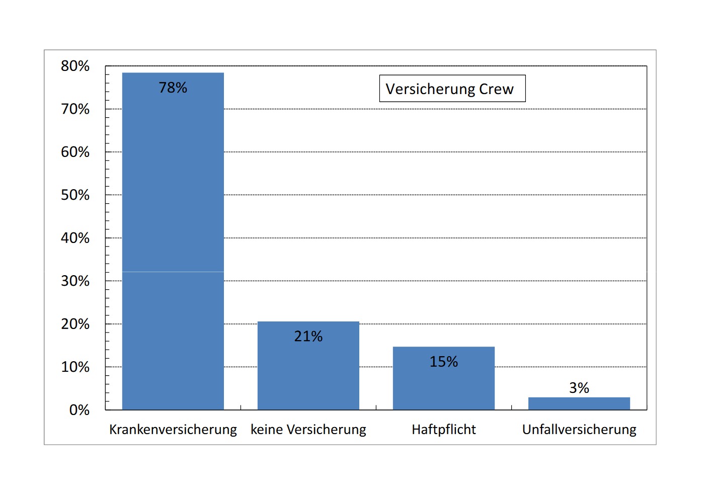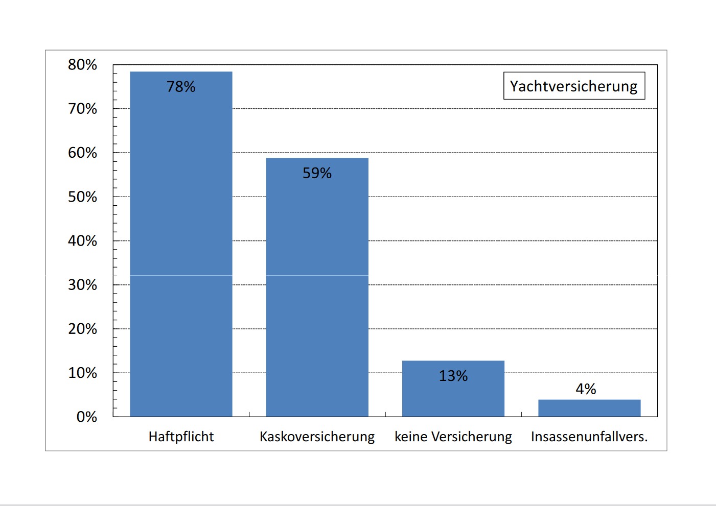 Dass die große Mehrheit der Yachten, nämlich 59% eine Kaskoversicherung haben, zeigt nicht nur das Sicherheitsbewusstsein der Weltumsegler, sondern auch deren guten finanziellen Verhältnisse, liegen doch die Prämien bei ungefähr drei bis fünf Prozent vom Wert der Yacht für die weltweite Fahrt - jährlich. 13% der Yachten waren ohne Versicherungsschutz, gingen also das Risiko für einen Schaden an der eigenen Yacht im vollen Umfang ein.