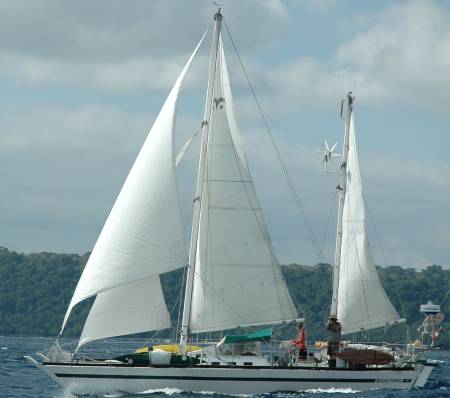 steuert verlässlich mit eigens gebauter Windfahne, sie ist gemütlich, ein richtiges Nest , war auch oft das Partyschiff in mit ihrer grossen Decksfläche.